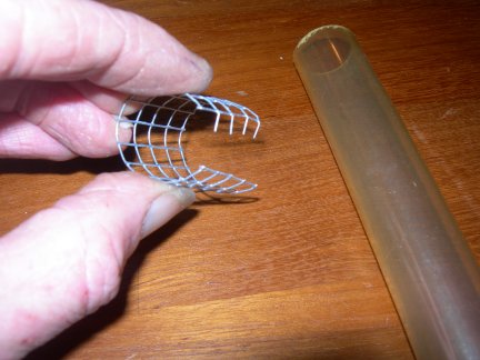 4. Fold/wrap wire sheet around your tube/broom handle/finger/PVA stick loader etc to get the rough shape and then locate the ribs bent at 90` into the sheet making sure to overlap each side by a 'square'. Hold in shape and bend ribs down by pushing flat with sides of long nose pliers. You can do this with your fingers but if you are making a few your fingers will become sore after a while.