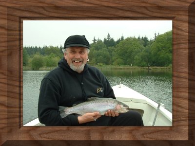 "I don't do boats," said Steve, apparently an often-repeated statement on the trip south. But with some persuasion (threats? surely not) he did agree to venture out with John ('ull). As I was imparting my vast knowledge of flies and lures to Mike - you know the expert-speak 'those greeny ones' and 'those with the shiny red bits', and we purchased some along with our tickets, I heard the dreaded words "you'll share a boat with Mike then Paul?" Me?, Paul?, NO, why me? - I don't get in boats either and had made that clear from the outset. Did I detect that an affinity was assumed betwixt tutor and tutee? Bl**dy hell, I agreed to get in the boat - how they managed that I don't know. I was not going to mention this :-) but remember that this was the day after the red/whites beat the reds, at the reds; Mike is red, and I am red/white. Can you swim he asks? As there is 30 feet of water out there. But there are doubles (whoops, mustn't use that word today) in there Graham said, so boats it was for us - just behave else a size eight in your nobbler will make tears, and barbed at that. Agreements and threats in place we made for the middle, Mike oaring like a veteran even with a broken paddle to larboard, and my sarnies and flask stowed securely at the flat end.